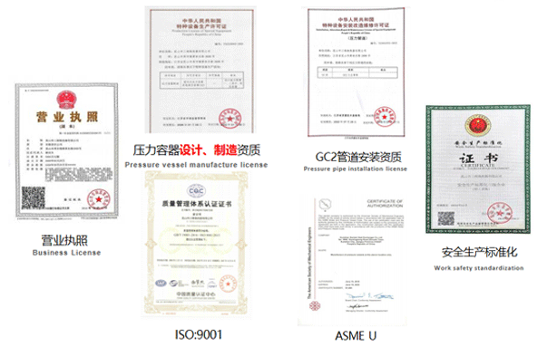 A2壓力容器制造許可證,D1/D2壓力容器設(shè)計(jì)許可證;GC2管道安裝許可證;ASME U/NB鋼印;ISO9001、ISO45001、ISO14001體系認(rèn)證證書等。